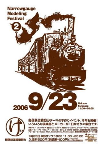 開催概要 日時:2006年9月23日(土・祝日) 11時~20時 場所:中野サンプラザ 8階 研修室2,5(2部屋) 入場料金:500円(小学生以下無料・要保護者同伴)/前売り券 400円 軽便鉄道模型祭(開催案内) 土曜日に中野サンプラザで開催された第2回軽便鉄…